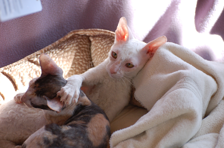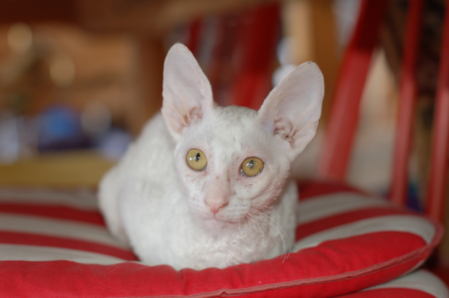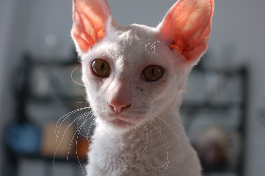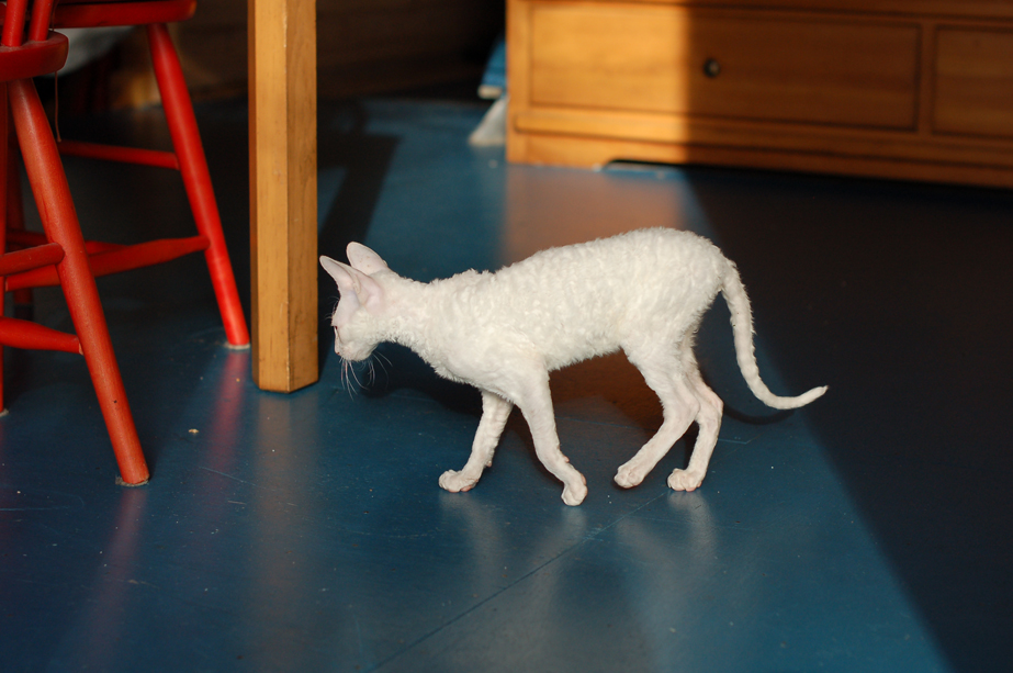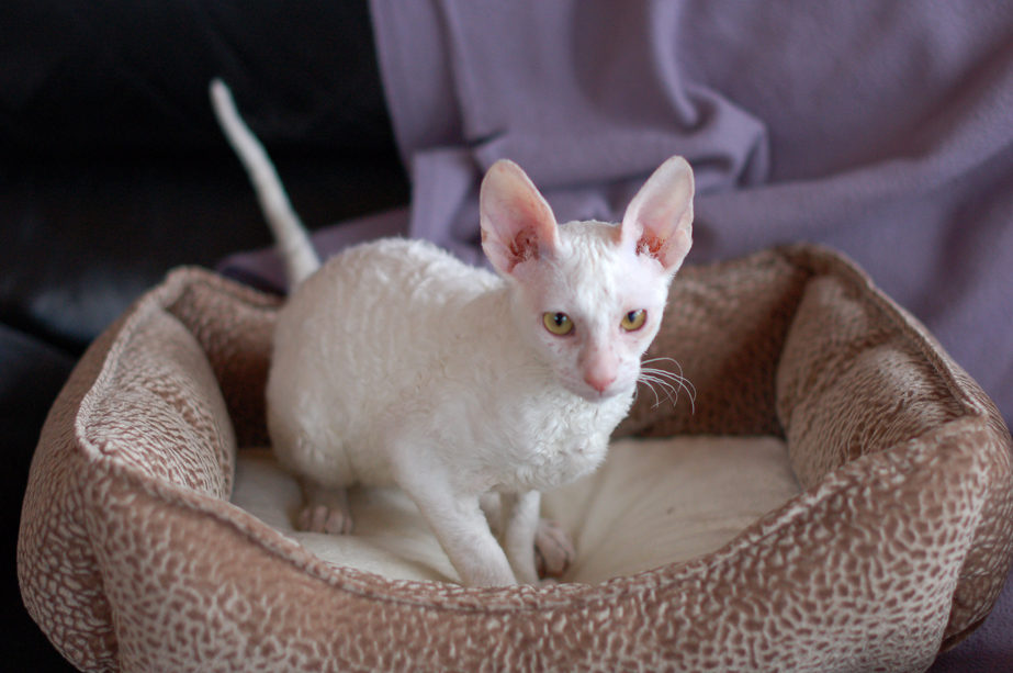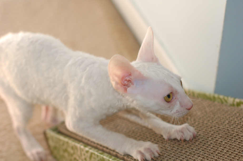 Billy is an all white male Cornish Rex. Born September 28, 2011. Unfortunately he passed away on March 25, 2012 after a very brief time with us. Even though his time was short he was a big part of out family. We will miss him dearly.